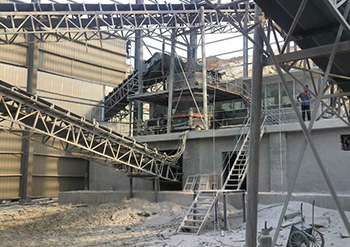 花崗巖原料由顎破破碎后經(jīng)中轉(zhuǎn)料倉進(jìn)入單缸液壓圓錐破HST100,將10-20mm直接篩走作為成品石子,0-10mm,20-30mm經(jīng)皮帶機(jī)進(jìn)入中專料倉進(jìn)高效制砂機(jī)VSI5X9532,出料再返回振動(dòng)篩篩分,然后成品進(jìn)洗砂機(jī)水洗后經(jīng)皮帶機(jī)輸送至成品料堆。