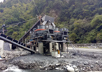 河卵石原料進入歐版液壓顎破PEW760進行粗破,然后經皮帶機進入單缸液壓圓錐破HST250進行二次破碎,然后進入調節(jié)料倉,經皮帶機把小于40MM的進入沖擊破VSI5X-1145進行制砂,成品0-5MM精品砂,目前質量和價格完全媲美優(yōu)質天然河沙。