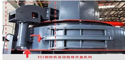 VSI4X和VSI5X制砂機均采用液壓裝置自動啟蓋,方便快捷移開上蓋,降低人工勞動強度,即使只有一人也可以輕松更換轉子及其配件,方便檢修,提高使用效率。