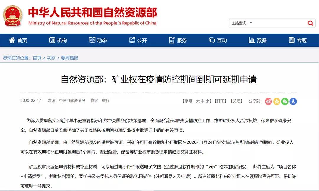 由自然資源部頒發(fā)的勘查許可證、采礦許可證有效期和補(bǔ)正期限在2020年1月24日到疫情防控措施解除前到期的,礦業(yè)權(quán)人可以在有效期和補(bǔ)正期限到期后3個(gè)月內(nèi),提出延續(xù)、保留等礦業(yè)權(quán)審批登記申請(qǐng)或提交補(bǔ)正材料。