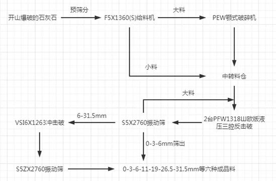 主機(jī)設(shè)備:PEW顎式破碎機(jī)、2臺(tái)PFW反擊破碎機(jī)、VSI6X制砂機(jī)