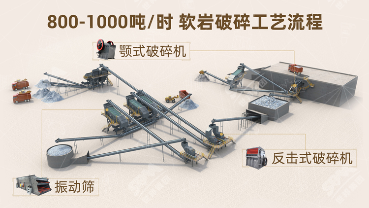 一級破碎設備常指的是顎式碎石機,它具有大的進料口,可以吞下將近1200㎜的巨石,但它進料大,出料也大,因此還需要二級破碎設備再處理,二級破碎設備為反擊式碎石機和圓錐式碎石機,反擊破比較適合處理軟物料,而圓錐破適合處理硬物料,二者選一即可。