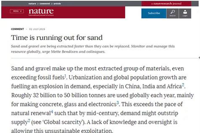 早在2019年,天然砂資源“告急”就已受到國際科技期刊雜志《自然》的報道,報道稱預計到本世紀中葉(2050年),地球上天然砂資源可能就再也滿足不了人類如此巨大的用砂需求,天然砂資源開采速度過快,天然砂供應開始“岌岌可危”。