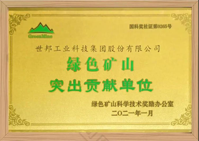 作為《砂石行業綠色礦山建設規范》(點擊閱讀)的起草單位,世邦集團多年來與國內外知名院校、設計院合作,注重綠色化、智慧化礦山建設,不斷加大創新力度,致力于為客戶項目綠色、高效、智能生產而提供增值服務。世邦憑借在綠色礦山領域取得的卓越成績,于2021年1月獲“綠色礦山突出貢獻單位”榮譽稱號。