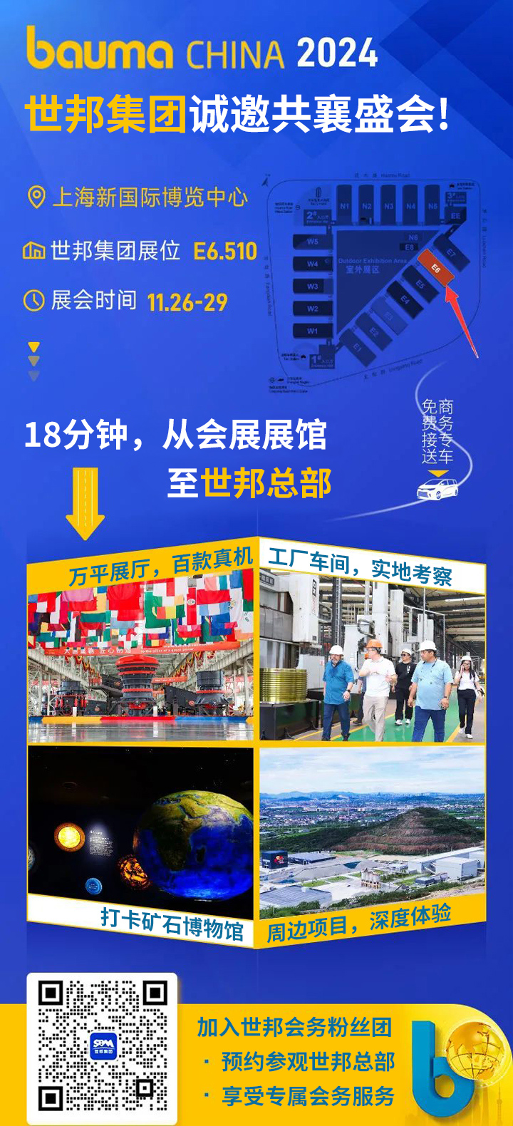 此次會展期間,我們也致力于將總部打造成破碎篩分設備領域的大型分會場,帶您暢游世邦全系列破碎、篩分、磨粉設備真機展廳,參觀先進的設備生產車間工廠,走訪上海及周邊砂石骨料、金屬礦加工、固廢處理等項目現場,讓您本次參展行程更充實,收獲更多!