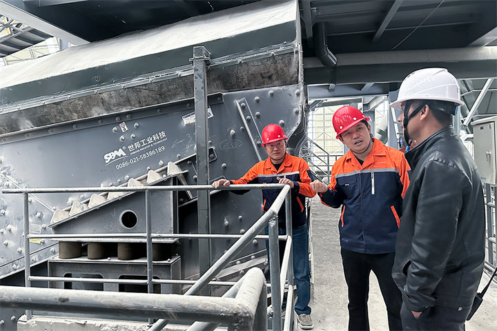 抵達客戶現場時產線正在生產狀態,回訪團首先對生產線進行了全面性的評估,整體狀態較為平穩??蛻糁赋稣駝雍Y篩網有時會出現堵塞問題,影響下料。世邦售后人員立刻做出響應,對振動篩進行了全面檢查后發現是長期生產導致的粘土過多,于是為客戶進行了篩網清理,并叮囑客戶針對篩網要定期清理以免物料堆積影響生產。交談中客戶表示,世邦設備使用至今非常滿意,遇到的一些問題反饋后,也會派相關人員及時前來解決,是值得信任的設備廠家。