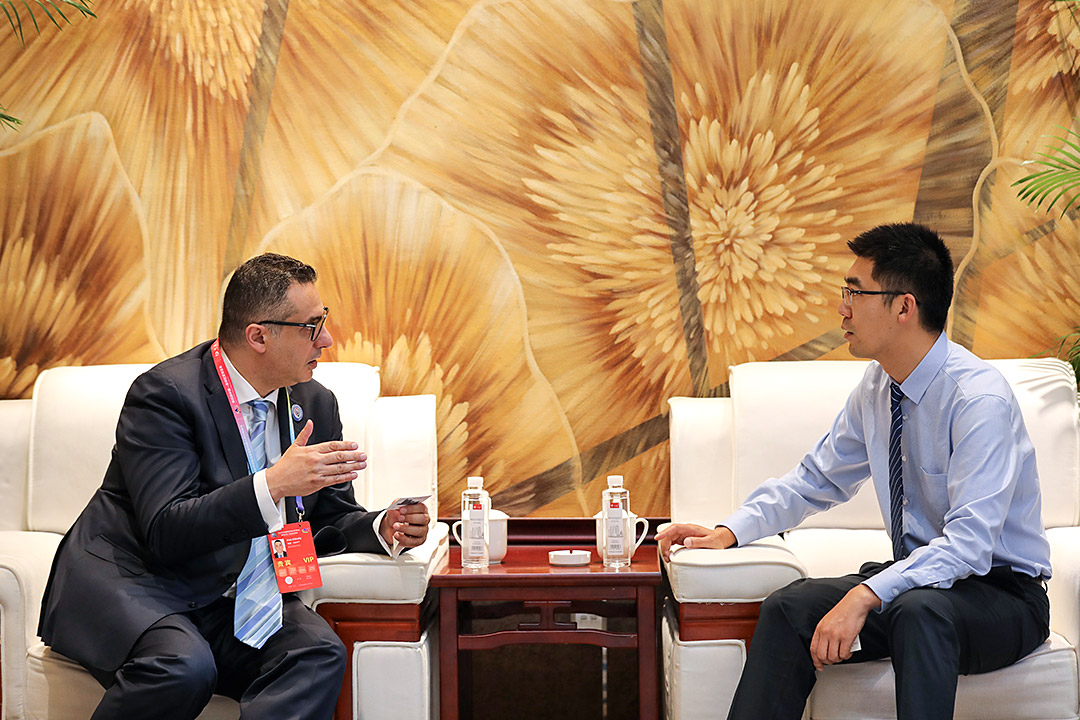 埃及投資與外貿部投資促進事務全權公使AlaaEl-Bially(左一)同世邦集團國際銷售總經理劉茂勇開展親切會談