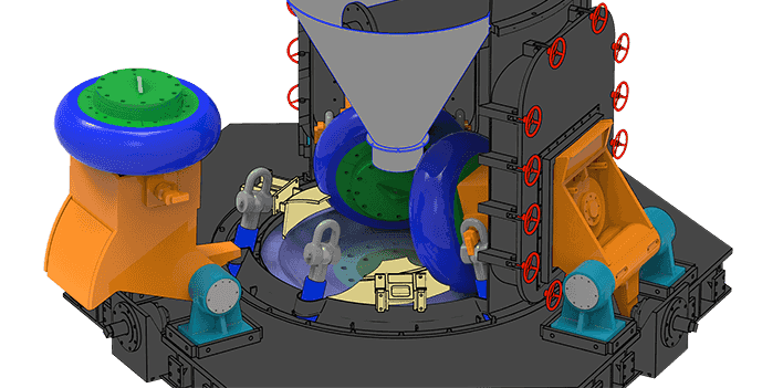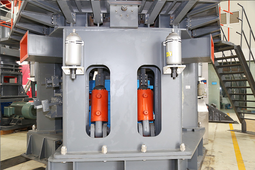 該機設計過程中我們充分考慮重型磨輥可能帶來的養護難題,最終開發設計了可翻轉結構。該結構配合液壓調整系統,操作員可輕松、快捷的將磨輥翻出機殼外部進行檢修,更換輥套、襯板等養護操作,減少停機損失。