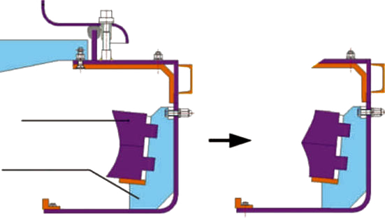根據(jù)生產(chǎn)實際,我們發(fā)現(xiàn)周護板多由中部開始磨損,采用一體式周護板的情況下,當(dāng)中部嚴重磨損時,就需要更換整塊護板,進而增加易損件使用成本;而采用世邦工業(yè)改進的分體式設(shè)計后,中部磨損后可以上下調(diào)頭使用,極大延長了周護板使用壽命,降低易損件成本耗費。